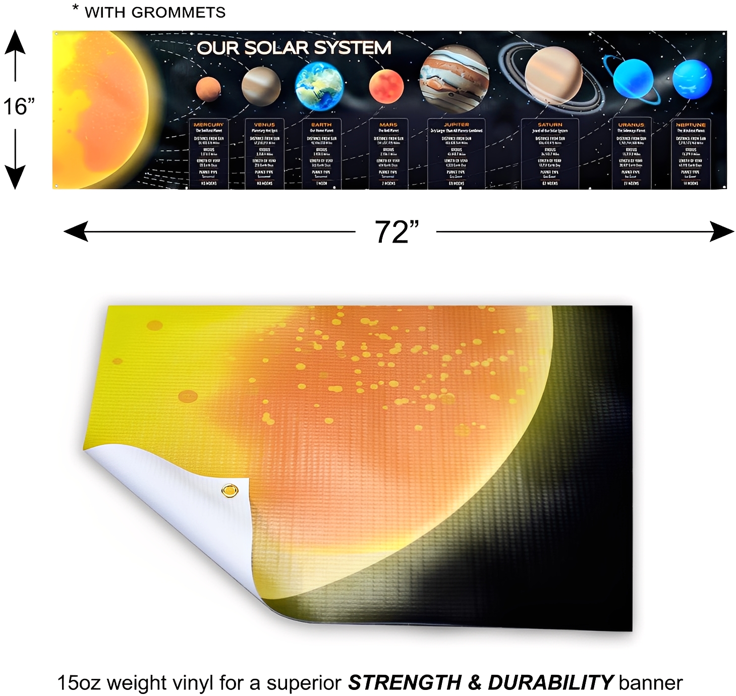 We use a premium heavyweight 13oz. scrim vinyl banner. It has a very smooth surface for best printing results. This material is typically used for billboards, building wraps, banners, event flags, trade show signage, parades, etc.